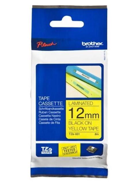 CINTA BROTHER TZE631 NEGRO EN AMARILLO 12MM X 8M