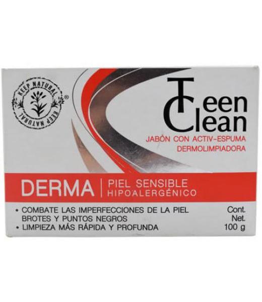 BENEFICIOS : TEEN CLEAN JABON DERMA ES HIPOALERGENICO PARA PIEL CON SENSIBLE O DELICADA CON ACNE LEVE A MODERADO. COMBATE LAS IMPERFECCIONES DE LA PIEL,BROTES Y PUNTOS NEGROS. LIMPIEZA MAS RAPIDA Y PROFUNDA CON SU ACTIVESPUMA DERMOLIMPIADORA.