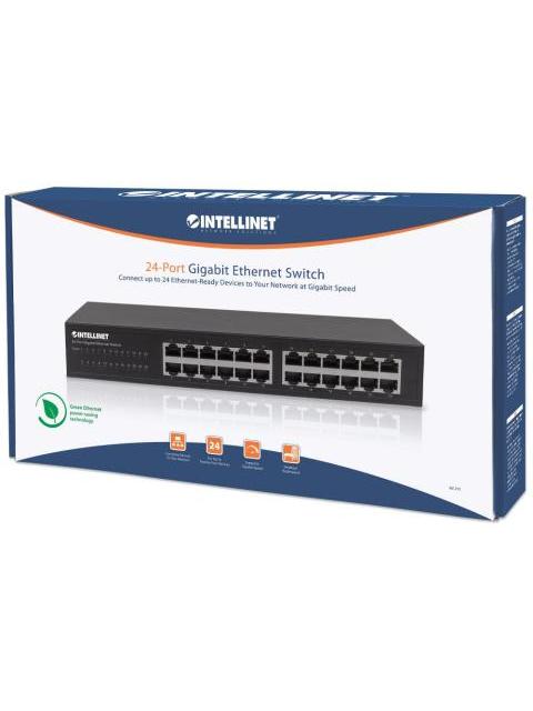 Aumente la velocidad de su red.El Switch Gigabit Ethernet de 24 puertos Intellinet (561273) ofrece un conjunto de características al tiempo que proporciona un rendimiento de red superior. Es muy fácil de configurar y no requiere configuración alguna. Gracias a su diseño de sobremesa y montaje en rack de 19, rendimiento y valor superior, el Switch Intellinet de 24 puertos Gigabit Ethernet es la opción perfecta para ampliar su red doméstica o de oficina pequeña.Rendimiento extremoCon una velocidad del backplane de 48 Gbps, hay mucho rendimiento disponible para sus ordenadores, servidores y otros dispositivos de red. Características AutomáticasEste Switch Gigabit LAN incluye muchas características automáticas que lo hacen fácil de usar. No se requiere configuración, por lo que la instalación es Plug and Play y sin complicaciones. El crossover Auto-MDI/MDI-X en todos los puertos elimina la necesidad de cables cruzados. Cada uno de los 24 puertos detecta automáticamente la velocidad de enlace del dispositivo de red conectado y se ajusta a 10,100 ó 1000 Mbps para obtener compatibilidad y máximo rendimiento.Funcionamiento fiableEl Switch Gigabit Ethernet Intellinet de 24 puertos Gigabit soporta el control de flujo cuando se opera en modo semi-dúplex e IEEE 802.3ab en modo full duplex para garantizar que la transferencia de datos y la conectividad de red funcionen sin problemas e ininterrumpidamente. Junto con el control de tormentas de difusión y el método de conmutación de almacenamiento y reenvío, los modos full y half-duplex garantizan que sus conexiones permanezcan activas incluso en condiciones de grandes cargas.Tecnología Green EthernetLa mayoría de las veces, un Switch de red no utiliza todos sus puertos en todo momento. Normalmente, cuando un ordenador, portátil, impresora de red u otro dispositivo conectado a la red se apaga, el switch sigue consumiendo la misma cantidad de energía que si estuviera activo. Ahora, gracias a la nueva y eficiente tecnología IEEE 802.3az, el Switch Intellinet de 24 puertos Gigabit detecta el estado del enlace a todos los dispositivos conectados y reduce el consumo de energía de los puertos no utilizados. Además, el Switch Intellinet puede ajustar el nivel de potencia de salida basándose en la longitud del cable de red conectado a un puerto en particular. Esta característica permite disfrutar del máximo rendimiento de la red y, cuando las cosas se ralentizan, reduce automáticamente el consumo de energía para ahorrar energía y ahorrar dinero.