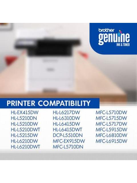 Este cartucho de tinta de alto rendimiento (XL) es compatible con las impresoras Brother de los modelos HL-L5210DN, HL-L5210DW, HL-L5210DWT, HL-L5215DW, HL-L6210DW, HL-L6210DWT, HL-L6217DW, HL-L6310DW, HL-L6415DW, HL-L6415DWT, HL-EX415DW, DCP-L5510DN, MFC-L5710DN, MFC-L5710DW, MFC-L5715DW, MFC-L5717DW, MFC-L5915DW, MFC-L6810DW, MFC-L6915DW y MFC-EX915DW.